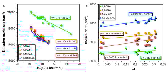 Two of the most common ways to quantify the solvatochromic effect in solvents of different polarity is to plot the fluorescence emission maxima (νEm) as a function of the empirical solvent polarity parameter ET(30) [] and the Lippert–Mataga (LM) plot [,], which are presented in Figure 6.