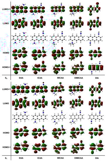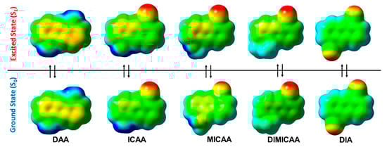 Molecular electrostatic potential (MESP) isosurfaces have also been created for the relaxed ground and excited states as shown in Figure 8. There is no visible difference in the MESPs of the S0 and S1 in the case of the diamino and diisocyano structures, DAA and DIA, respectively (Figure 8). However, a slight difference between the ground and excited state MESPs of ICAA, MICAA and DIMICAA can be seen. However, these cannot be associated with significant changes in the geometries. The largest difference between the S0 and S1 MESPs occurs on the isocyano group in case of MICAA, where a rotation of the methylated amino group is also experienced.