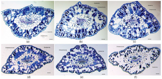 Significant differences in thickness of chlorenchyma were also observed in transversal sections of needles sampled in maritime pine plants derived from somatic embryos matured at different temperatures. In M28 plants, this leaf tissue was initially larger than in M18 and M23 plants (Table 1; Figure 1a–c). At the end of the heat stress treatment, the thickness of chlorenchyma was significantly reduced in M28 plants, but increased in M18 and M23 plants (Table 1 and Figure 1d–f).