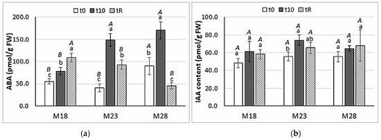 Needles sampled in maritime pine plants derived from SE matured at 28 °C (M28) showed basal levels of ABA (t0) significantly higher than those from M18 and M23 plants (90.1 ± 19.2 pmol/g FW front to 55.5 ± 5.7 and 41.0 ± 8.7 pmol/g FW, respectively). Heat stress treatment significantly increased ABA levels in the three groups of plants (p < 0.001), particularly in those derived from SE matured in standard conditions (M23), which showed a 3.6-fold increase as compared to the basal ABA level (Figure 3a). After the recovery period, M18 plants showed ABA levels higher than those observed at the end of the stress, while ABA content decreased significantly in M23 and M28 plants. It is interesting to note that basal ABA levels were not recovered in M23 plants, while in M28 plants they were lower at tR than at t0. In contrast, levels of indole-3-acetic acid (IAA) (Figure 3b) did not vary throughout the heat stress experiment in M18 (p = 0.097) nor in M28 plants (p = 0.307), while the content of this hormone significantly increased in M23 plants (p = 0.004) at the end of the stress (t10).