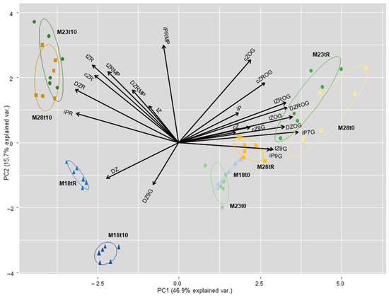 Results of the analysis when determined metabolites were grouped by CK types. Total iP-type CK content varied significantly throughout the heat stress experiment (p < 0.001), and this variation depended on the group of plants, as total iP levels decreased in M18 plants at the end of the stress (from 0.34 ± 0.04 to 0.22 ± 0.03 pmol/g FW), while it increased in M23 and M28 plants (from 0.26 ± 0.04 to 0.45 ± 0.06 pmol/g FW, and from 0.28 ± 0.06 to 0.50 ± 0.12 pmol/g FW, respectively). After the recovery period, total iP contents in M18 and M28 plants returned to levels similar to those at t0, while remaining unchanged in M23 plants.