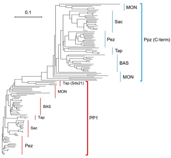 https://www.yeastgenome.org/blast-sgd, accessed on 20 April 2021) and classified as PP1 or Ppz1 accordingly.