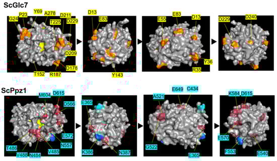 Tables S2 and S3). We identified 30 such changes, of which 23 can be considered quite constant. In 14 of those, changes were from acidic in PP1 to neutral residues in PPZ (or vice versa), whereas 7 implied the substitution of a basic residue by a neutral one (or vice versa). Two remarkable modifications were PP1c K210 and K259, which were changed to D in the PPZ of all fungi evaluated (D566 and D615 in ScPpz1). These residues were mapped on the surface of models constructed for ScGlc7 and ScPpz1 (