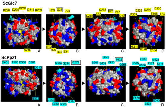 Figure 3, when models for ScGlc7 and ScPpz1 are constructed, many residues from these groups map onto the surface of both proteins. Interestingly, several of the class A differences, such as N484, T486, V488 or M604, map near the PPZ catalytic site. We considered this last group as particularly relevant to predict possible PPZ-specific functional features.