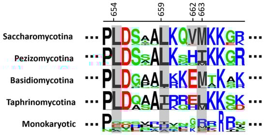 32] presented evidence that CaPpz1 contains a C-terminal extra α-helix that is not present in mammalian PP1c(α). This feature is related to another characteristic difference located at the N-terminal region of the phosphatase. In CaPpz1, the N-terminal helix A’ extends an extra turn in comparison with mammalian PP1c(α), and the conformation of the loop connecting helix A’ and A (L1) is different in both phosphatases. These authors attributed a primary role for this difference to the fact that Y144 in PP1c(α) helix C is substituted by a smaller residue (C309 in CaPpz1). Remarkably, the equivalent position in ScGlc7 (Y143) is conserved in most fungal PP1 enzymes (in the few exceptions, F, an equally bulky and hydrophobic residue, is present). This same position in Ppz is also a C in all Saccharomycetales, in most Pezyzomycetes; it is also common in other clades, and, when not present, it is usually substituted by a small side chain residue (T or A). Since the authors proposed that this change results in the widening of the pocket defined by helix A’, L1, and helix B, it can be concluded that such a structural feature would be shared by virtually any fungal Ppz enzyme.