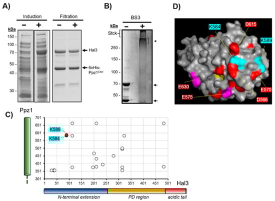 Bacterial cultures were grown in a shaker at 37 °C to an OD600 of 0.6–0.8. Recombinant protein expression was initiated by addition of isopropyl-ß-D-thiogalactopyranoside (IPTG) at 0.1 mM and continued for 16 h at 21 °C. Cultures were centrifuged at 6500× g for 20 min at 4 °C, and pellets were resuspended in lysis buffer (50 mM NaH2PO4 pH 7.5, 150 mM NaCl, 20 mM Imidazole, 0.1% Triton X-100) containing Complete EDTA-free protease inhibitor cocktail (Roche, Sant Cugat del Vallès, Spain) plus 2 mM PMSF (approximately 3 mL of buffer per gram of pellet). Samples were placed on ice and sonicated using a Vibra-cell (Sonics and Materials Inc.) equipment for 5–6 min (10 s on, 10 s off) at 30% amplitude. Samples were then centrifuged at 4 °C (12,400× g for 30 min) to remove cellular debris. The soluble fraction was incubated with Ni-NTA Agarose beads (Qiagen®, Hilden, Germany) following the manufacturer’s specifications and loaded in a 10 mL column. The mixture was washed with about 5 bed volumes of lysis buffer (without Triton X-100) until the eluate was free of proteins (monitored by the Bradford’s reagent). The 6x-His tagged Ppz1-Cter/Hal3 complex was recovered by incubating the beads for 10 min with 1.5 bed volume of elution buffer (washing buffer containing 150 mM imidazole). Finally, imidazole was eliminated by exchanging the elution buffer with cross-linking buffer (50 mM NaH2P04 pH 7.5, 150 mM NaCl) using an Amicon® Ultra Centrifugal filter (size 30 kDa, Millipore, Burlington, MA, USA). The amounts of the recovered recombinant proteins were determined by SDS-PAGE followed by Coomassie-blue staining and scanning of the gels with an Epson Perfection V500 Photo Scanner. Quantification was done with the Gel Analyzer software (version 2010a) and different amounts of bovine serum albumin (BSA) as standards.
