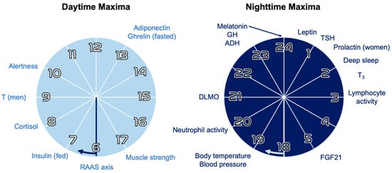 Hours of daily and nightly maxima for selected hormones and processes. These periodic oscillations are kept approximately constant via circadian rhythms of neuroendocrine signaling, which in turn is regulated by circadian clock genes [7,16]. RAAS = renin–angiotensin–aldosterone system; T = testosterone; DLMO = dim-light melatonin onset; GH = growth hormone; TSH = thyroid stimulating hormone; T3 = triiodothyronine; FGF = fibroblast growth factors. Adapted with permission from ref [16], copyright 2018 Springer Nature.