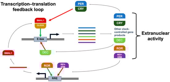 These physiologic oscillations are driven by a highly conserved set of clock genes that form an autoregulatory transcription–translation feedback loop. The classical model of this core clock network is illustrated in Figure 2. For consistency, some common protein aliases will be used throughout this review, i.e., ARNTL will be referred to as “BMAL1”, and NR1D1 will be referred to as “REV-ERBα”. The heterodimer BMAL1:CLOCK binds E-box DNA response elements and enhances the transcription of clock-controlled genes, which include other clock proteins, i.e., isoforms of PER, CRY, REV-ERB, and ROR. In addition to their numerous regulatory activities in the cytosol (including DNA damage repair and cell cycle gating), PER and CRY proteins heterodimerize in the nucleus to suppress BMAL1:CLOCK activity, inhibiting their own transcription until their levels decrease as they degrade over time. This ~24-h cycle is reinforced by other clock proteins; in addition to their respective extranuclear roles, RORα increases transcription by binding the ROR response element (RRE) in the BMAL1 promoter, and REV-ERBα suppresses it [16]. Other clock-controlled gene products that serve as circadian regulators include BHLHE40 and BHLHE41, often referred to as “DEC1” and “DEC2”, respectively; in addition to other functions in the cytosol, they bind the E-box promoter and prevent their own transcription [32].