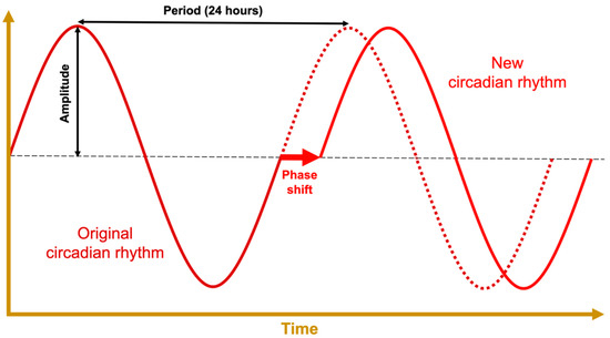 Artificial lights are used to treat major depressive disorder with seasonal pattern [69], but they may also be used to intentionally calibrate the central circadian pacemaker (see Figure 4) resulting in entrainment to a new, phase-shifted period (see Figure 3) [40,67]. Special lighting arrays are currently in use aboard the International Space Station for this purpose, to properly entrain the circadian rhythms of astronauts who do not experience 24-h day–night cycles [41,70]. In combination with proper scheduling, bright-blue light has been shown to be effective at helping combat jetlag and treating specific neuropsychiatric conditions on Earth [36].
