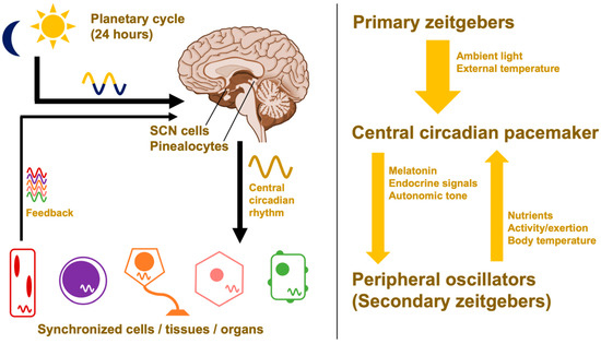Uncorrected, these slight deviations would lead to free-running periods that are out of phase with the Earth’s rotation; however, the central pacemaker’s circadian rhythm can be realigned through circadian entrainment (Figure 3). To keep in line with the day–night cycle, the hypothalamus takes input from environmental time cues—referred to as zeitgebers or “time givers”—and uses this information to calibrate the suprachiasmatic nuclei [6]. This central pacemaker then sends signals throughout the body via different pathways that include the pineal gland’s production of the hormone melatonin [63]. This coordinates the body’s peripheral clocks, producing circadian oscillations in cell activity and organ function. These outputs in turn provide feedback to the central pacemaker in the form of secondary zeitgebers like food intake, exercise, and body temperature [28,64,65].