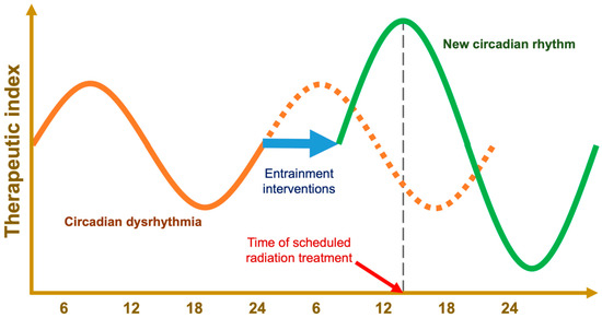 The retrospective breast cancer study suggested that patients who received doses after 15:00 h had a higher incidence of grade 2 or higher, acute skin toxicity than patients treated before 10:00 h [102]. This seems to contrast the results of the prospective trial, which found that radiation before 12:00 h increased the rate of acute breast erythema versus radiation after 12:00 h [101]. The latter study’s preference for later radiation administration is more consistent with the temporal radiotoxicity profiles of cervical, rectal, and esophageal cancer treatments (see Supplementary Table S1); however, the temporal separation between groups in the retrospective study should have been better equipped to detect the effect of time of day, assuming each patient had an ideal, eurhythmic circadian rhythm (see Figure 3).