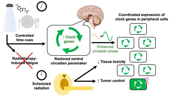 Supplementing radiation treatment with dietary modulation strategies like time-restricted feeding may improve tumor control by regulating circadian functions. These periods of nutrient deprivation or fasting may in fact mediate their antitumor effects by using the same machinery that allows food intake to act as a secondary zeitgeber, e.g., caloric restriction drives an oxygen-dependent cell environment via pathways that use core clock proteins and other circadian effectors. Although beyond the scope of this review, the microbiome is also an important consideration; gut microbiota have been proposed as a mediator of circadian radiosensitivity [17].