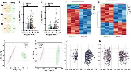 In trout infected with A. salmonicida, RNA-seq analysis showed 855 (163 down and 692 up) and 603 (306 down and 297 up) DEGs in the brain and kidney, respectively (Figure 1A–C). We further observed that 5 DEGs were down-regulated in both brain and kidney, while 46 DEGs showed up-regulation in both the brain and kidney (Figure 1B,C). The statistical results of DEGs are represented in volcano plots and heatmaps (Brain: Figure 1D,F; Kidney: Figure 1E,G). The separated clusters in PCA plots indicated trout in CT and IT exerted different transcriptomic profiles in the brain and kidney (Figure 1H,I). The loading plot showed the values of each gene resulted in separated clusters in PCA plots (Figure 1J,K).