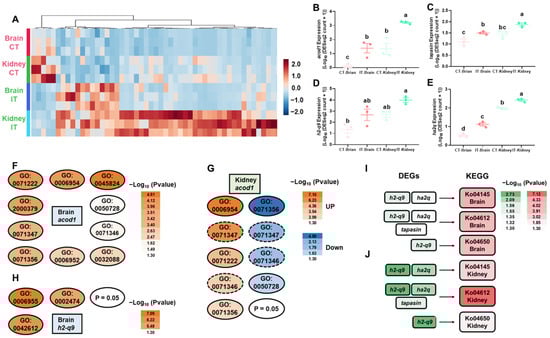 Differently expressed genes commonly identified in the brain and kidney in response to A. salmonicida infection. (A) The heatmaps of differently expressed genes commonly identified in the brain and kidney; (B–E) The interleaved scatters of acod1, tapasin, h2-q9, and ha2q (Different letters indicate significant differences, p < 0.05, one-way ANOVA with Tukey’s test); (F,G) The GO terms associated with acod1. GO:0045824, negative regulation of innate immune response; GO:0006954, inflammatory response; GO:0071222, cellular response to lipopolysaccharide; GO:2000379, positive regulation of reactive oxygen species metabolic process; GO:0071347, cellular response to interleukin-1; GO:0071356, cellular response to tumor necrosis factor; GO:0006952, defense response; GO:0032088, negative regulation of NF-κB transcription factor activity; GO:0071346, cellular response to interferon-gamma; GO:0050728, negative regulation of inflammatory response. (H) The GO terms associated with h2-q9. GO:0006955, immune response; GO:0042612, MHC class I protein complex; GO:0002474, antigen processing and presentation of peptide antigen via MHC class I. (I,J) The KEGG pathways commonly enriched in brain and kidney with h2-q9, ha2q and tapasin. Details of heatmaps, GO terms and KEGG pathways are shown in Tables S2–S4.