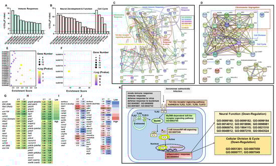 The enrichment analyses of DEGs in the brain in response to A. salmonicida infection. (A) GO terms associated with immune functions (up-regulated in infected trout); (B) GO terms associated with neural functions and cell cycle (down-regulated in infected trout); Predicted functional networks between the up-regulated genes (C) and down-regulated genes (D). The networks were established by the database of STRING Version 11 (http://string-db.org/, last accessed on 21 December 2021, based on zebrafish). (E) KEGG pathways associated with immune and neuro/endocrine functions (up-regulated in infected trout); (F) KEGG pathways associated with cell cycle and steroid hormone functions (down-regulated in infected trout). (G–J) Heatmap of the candidate genes. (G) Up-regulated genes enriched in GO terms; (H) Up-regulated genes enriched in KEGG pathways; (I) Down-regulated genes enriched in GO terms; (J) Down-regulated genes enriched in KEGG pathways. (K) The putative pathways of trout brain in response to A. salmonicida infection. Details of heatmaps, GO terms, and KEGG pathways are shown in Tables S4–S6.