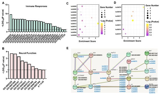 The enrichment analyses of DEGs in the kidney in response to A. salmonicida infection. (A) GO terms associated with immune functions (up-regulated in infected trout); (B) GO terms associated with neural functions (down-regulated in infected trout). (C) KEGG pathways associated with immune functions (up-regulated in infected trout); (D) KEGG pathways associated endocrine functions (up-regulated in infected trout). (E) Predicted functional networks between the DEGs. The networks were established by the database of STRING Version 11 (http://string-db.org/, last accessed on 21 December 2021, based on zebrafish). Details of GO terms and KEGG pathways are shown in Table S4.