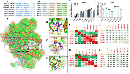 Identification of novel csf-1r gene subtypes and characterization of the expression and function. (A,B) Alignment of novel trout csf-1r gene subtypes to teleost and mammalian species. (A) Alignment of transmembrane domains of novel trout CSF-1R subtypes to teleost and mammalian species. (B) Alignment of juxtamembrane domains of novel trout csf-1r gene subtypes to teleost and mammalian species. The JM-B (buried region), JM-S (switch motif), and JM-Z (zipper region) are shaded by different colors and the conserved tyrosine residues are highlighted red. The whole sequence alignment and phylogenetic tree of CSF-1R are shown in Figures S2 and S3. (C–F) Comparison of the predicted crystal structures of JM-B (D), JM-S (E), and JM-Z (F) between trout and human CSF-1R orthologous. The green illustration shows the human CSF-1R, and the orange illustration shows the trout CSF-1RA1 (LOC100136949). The conserved tyrosine residues are highlighted by a red circle. The comparison model was built via the SWISS-MODEL server (https://swissmodel.expasy.org/, last accessed on 21 December 2021) with human macrophage CSF-1R (3KRJ). (G–L) The expression profiles of csf-1 and csf-1r systems in brain (G) and kidney (H). The Pearson’s correlation analysis ((I), brain; (K), kidney) and p value ((J), brain; (L), kidney) of csf-1 and csf-1r systems in trout in CT and IT. The “*” indicates a significant difference between CT and IT (p < 0.05).