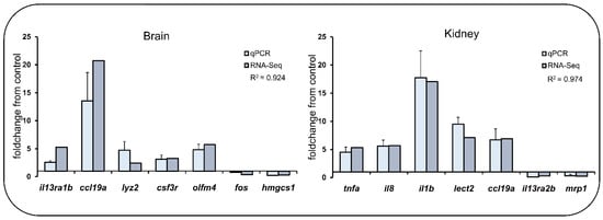 Rainbow trout (~10 g and ~8 cm) were obtained from trout farm in Linqu, Shandong Province, and then acclimated for 7 days in individual aquariums at ~17 °C with the photoperiod of 12:12 (hours) of light and dark. During bacterial challenge, trout were randomly classified into two groups as control trout group (CT) and infected trout group (IT), respectively. IT contained two replications and each replication had 20 individuals (n = 20). Based on our previous study [], trout of IT were intraperitoneally injected with 0.2 mL of A. salmonicida (1 × 108 CFU/mL), while trout in CT were injected by an equal volume (0.2 mL) of phosphate buffer solution (PBS). Furunculosis symptoms (Figure S4) were observed at 48 h after infection; therefore, trout in both the CT and IT groups were euthanized by MS-222 (35–45 mg/L) and then sampled at 48 h. The brains and kidneys were collected after washing with PBS (remove blood and fat cells) and then stored at −80 °C for further analyses. Two individuals in IT were pooled as one sample to reduce the individual variations for further analyses.