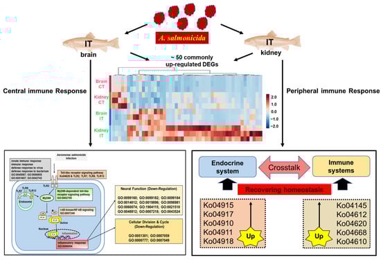 The pairwise comparison between trout of the CT and IT groups (Figure 7) showed that the kidney and brain shared ~50 up-regulated DEGs with signaling pathways including antigen presentation (ko04145, ko04612), toll-like receptors and cytokine functions (ko04620, ko04668), and complement and coagulation cascades (ko04610). This evidence confirmed that A. salmonicida infections resulted in homogeneously immune effects on both central and peripheral tissues, rather than CNS immune privilege. In the brain, the up-regulated DEGs were associated with activation of the toll-like receptor signaling pathways, thus triggering neuroinflammation and dysregulated neuro functions. Therefore, the typical disease characteristics of infected trout, such as symptoms of anorexia and lethargy, could be partly attributed to the dyshomeostasis between immunomodulation and neuromodulation in brain. In addition, kidneys also showed up-regulated endocrine networks involved in estrogen, prolactin, and insulin signaling pathways and thyroid hormone synthesis, supporting the bi-directional crosstalk between endocrine and immune systems in response to pathogen infection.