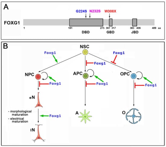 - Among the three mutant FOXG1 alleles subject of the present pilot study, FOXG1G224S (encoding for a protein with altered DBD) and FOXG1W308X (encoding for a protein missing GBD and JBD) generally performed as a GOF and a LOF allele, respectively, while FOXG1N232S (encoding for another protein with altered DBD) acted as a mild LOF allele or phenocopied FOXG1WT;