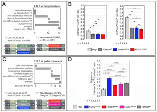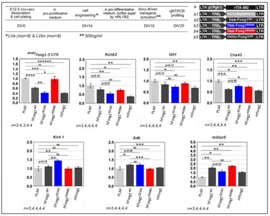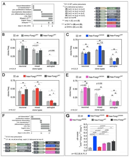 - Falcone, C.; Santo, M.; Liuzzi, G.; Cannizzaro, N.; Grudina, C.; Valencic, E.; Peruzzotti-Jametti, L.; Pluchino, S.; Mallamaci, A. Foxg1 Antagonizes Neocortical Stem Cell Progression to Astrogenesis. Cereb. Cortex 2019, 29, 4903–4918. [Google Scholar] [CrossRef] [PubMed]