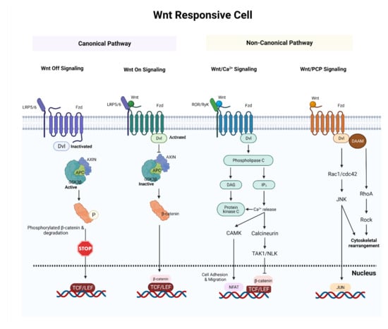 A synopsis of the canonical and noncanonical Wnt signaling pathways. In canonical Wnt off signaling, a combination of AXIN and APC allows GSK3β to phosphorylate β-catenin and target it for proteolysis. In canonical Wnt on signaling, Wnt ligands bind and activate Fzd receptor and activated Fzd receptor recruits Dvl protein and AXIN. This blocks the formation of an AXIN–APC complex and inhibits GSK3β. As a result, β-catenin avoids destruction and accumulates in the nucleus. In non-canonical Wnt/Ca2+ signaling, the interaction of Wnt/Fzd with ROR/Ryk co-receptor leads to the formation of IP3 and DAG. DAG activates PKC. IP3 triggers ER Ca2+ release which stimulates calcineurin and CAMKⅡ. This activates TAK1/NLK and NFAT. Activated TAK1/NLK can inhibit TCF/β-catenin signaling and NFAT can regulate cell adhesion and migration. In non-canonical Wnt/PCP signaling, the interaction of Wnt/Fzd leads to the recruitment of Dvl, which utilizes its domains (PDZ and DIX) to produce a complex with DAAM. DAAM then stimulates RhoA. Activated RhoA can activate Rock. Dvl can also produce a complex with Rac1 to activate JNK. Abbreviations: APC, adenomatous polyposis coli; GSK3β, glycogen synthase kinase 3β; LRP5/6, low-density lipoprotein receptor-related protein 5/6; TCF/LEF, T-cell factor/lymphoid enhancer-binding factor; IP3, inositol trisphosphate; DAG, diacylglycerol; CAMKⅡ, calcium/calmodulin-dependent protein kinase II; TAK1, transforming growth factor beta-activated kinase 1; NLK, nemo like kinase; NFAT, nuclear factor of activated T-Cells; Dvl; disheveled; Fzd, frizzled; DAAM, disheveled-associated activator of morphogenesis, ROCK, Rho-associated kinase. (Created with https://biorender.com/, accessed on 18 December 2021).