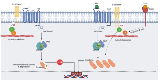 In epithelial cell–cell adhesion and Wnt signaling, the E-cadherin/β-catenin complex plays a critical role. In the absence of Wnt ligand (on the left), activated GSK3β can phosphorylate β-catenin, which leads to its proteasomal degradation. As result of that, β-catenin remains in the cadherin/β-catenin/α-catenin complex that is attached to the cytoskeleton (created with https://biorender.com/, accessed on 12 September 2021). In the presence of Wnt ligand (on the right), inactivated GSK3β cannot phosphorylate β-catenin, and this results in free β-catenin and its nuclear accumulation. EGF signaling via EGFR, ERK1/2, and CK2 leads to phosphorylation of α-catenin and enhances β-catenin transactivation [26,33]. Abbreviations: EGF, epidermal growth factor; EGFR, epidermal growth factor receptor; ERK1/2, extracellular signal-regulated protein kinase; CK2, casein kinase 2. (Created with https://biorender.com/, accessed on 9 December 2021).