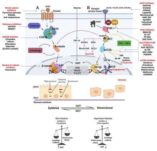 Despite the prevalence and apparent reliance on PI3K signaling in glioma, PI3K inhibitors exert cytostatic rather than cytotoxic effects in glioma cell lines and xenografts even when combined with inhibitors of the epidermal growth factor receptor (EGFR) and mTOR [22]. Thus, the inhibition of PI3K may activate other pathways and processes, such as Wnt/β-catenin and EMT, respectively, both of which enhance cell survival. Combining PI3K inhibitors with drugs blocking these pathways may promote GBM apoptosis.