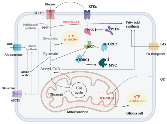 Metabolic reprogramming in glioma. The metabolic switch between glycolysis and TCA cycle in GBM is summarized and amino acid biosynthesis and transport in crosstalk with mTORC1 and mTORC2 are shown. In addition, the crosstalk of fatty acid biosynthesis and TCA/glycolysis cycle is briefly outlined (created with https://biorender.com/, accessed on 14 July 2021).