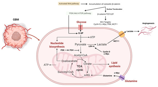 The role of the Wnt and PI3K/Akt/mTOR signaling pathways in glioma aerobic glycolysis. The association of β-catenin to TCF-LEF results in the transcription of Wnt-sensitive genes (PDK, c-Myc, cyclin D, MCT-1). MCT-1 promotes lactate extrusion from the cytosol, hence promoting angiogenesis. Activating PI3K/Akt results in an increase in glucose metabolism. By activating HIF-1α, which inhibits glucose entry into the TCA cycle, Akt-transformed cells defend against ROS damage. HIF-1α-induced PDK1 phosphorylates PDH, culminating in the conversion of cytosolic pyruvate to lactate through the activation of LDH-A. Because PDK inhibits the PDH complex in the mitochondria, pyruvate cannot be converted completely to acetyl-CoA and enter the TCA cycle. Additionally, c-Myc and cyclin D activate LDH-A, which catalyzes the conversion of cytosolic pyruvate to lactate. c-Myc facilitates the entrance of glutamine into the cytosol and mitochondria. Glutamate generated by c-Myc promotes aspartate and nucleotide synthesis [229]. Abbreviations: PDK, pyruvate dehydrogenase kinase; MCT-1, monocarboxylate transporter 1, ROS, reactive oxygen species; PDH, pyruvate dehydrogenase; LDH-A, lactate dehydrogenase A (created with https://biorender.com/, accessed on 28 December 2021).