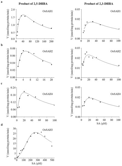 OsSAH recombinant proteins purified from Escherichia coli were tested for enzymatic activity using SA, BA, tCA, or caffeic acid as substrates. Hydroxylase activity was only detectable on the SA substrate analyzed using LC–MS/MS, suggesting high substrate specificity of OsSAH proteins. OsSAH1–4 proteins had both SA 3- (SA3H) and 5-hydroxylase (SA5H) activity except of OsSAH3, which converted SA to 2,5-DHBA only. The biochemical parameters of OsSAH1–4 proteins are listed in Table 1. Each OsSAH protein showed higher Kcat and Kcat/Km values for SA5H than for SA3H activity, suggesting that the enzyme favored the conversion of SA to 2,5-DHBA in vitro. In addition, OsSAH proteins exhibited substrate SA inhibition, showing a parabolic velocity curve (Figure 1). OsSAH3 was used to determine the optimal enzymatic conditions owing to its large Km value, and it showed an optimal pH of approximately 6.8 and a temperature of 40 °C under the assay conditions (Figure S1).