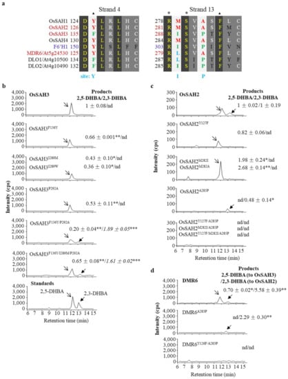 Arabidopsis DMR6 protein is more similar to OsSAH2 than to OsSAH3, but shows only SA5H activity, as determined by the HPLC method [] (Figure 2a). Interestingly, SA5H activity was completely absent in the DMR6A283P mutant, similar to the corresponding OsSAH2 mutant, and SA3H activity was markedly suppressed, as determined by the LC–MS/MS method (Figure 2d). The DMR6Y126F/A283P double mutant produced undetectable products (Figure 2d).