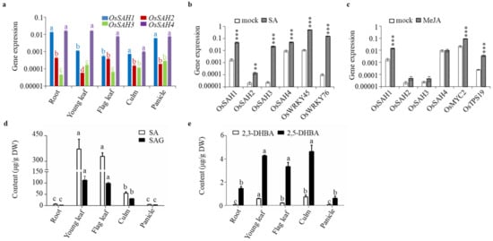 Expression of OsSAHs and accumulation of SA and its related compounds. OsSAH1–4 expression in different tissues (a), induction by SA (b), and MeJA (c). Roots and young leaves were from ten-day-old seedlings cultured in 1/2 MS liquid medium. Flag leaves, culms, and panicles were from plants of three weeks post heading grown in the paddy field. Ten-day-old seedlings cultured hydroponically were treated with 500 μM SA or 100 μM MeJA in 5 mM MES buffer for 6 h. For the mock treatment, the seedlings were received the same volume of DMSO solvent. Gene expression was determined by qRT-PCR using OsUBQ as the reference gene. (d) SA and SAG, (e) 2,3- and 2,5-DHBA. Values are means ± SD (n = 3). Asterisks indicate statistically significant differences compared with the corresponding mock using student’s t-test (**, p < 0.01; ***, p < 0.001). Columns marked with different letters (a–c) indicate significant differences among the same tissue (a), and the same compound (d), as analyzed by the SPSS software (Duncan’s multiple range test, α = 0.05).