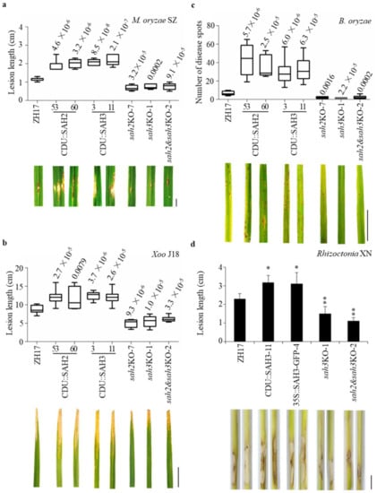 Knockout of OsSAH2–3 genes conferred resistance to both hemibiotrophic and necrotrophic pathogens. Disease symptoms and lesion lengths or lesion numbers of the transgenic and wild type ZH17 plants were shown. (a) Disease phenotypes and lesion lengths of M. oryzae. Plants of the tillering stage (about three-month-old) were injected with hemibiotrophic fungus M. oryzae SZ spores (1 × 105 conidia/mL). The disease segments were photographed and quantified at 9 d after the injection. (b) Disease phenotypes and lesion lengths of Xoo. Three-month-old rice plants were inoculated with a hemibiotrophic bacterium Xoo J18 strain. Disease symptoms were photographed and evaluated at 18 d after the challenge. (c) Disease phenotypes and severity of B. oryzae. The transgenic and ZH17 control plants were grown in the paddy field of the experimental station and infected naturally. Evaluation of disease severity and photography taken were conducted about four months after the seed germination in year 2019. Disease numbers were determined on 20 cm of each leaf started 2 cm from the tip (n = 10). (d) Disease phenotypes and lesion lengths of Rhizoctonia solani. Five-week-old rice plants were inoculated with necrotrophic fungus Rhizoctonia XN isolate. A slice of filter paper containing the Rhizoctonia mycelia was pinned around the sheath bottom. Lesion lengths were measured 4 d after the inoculation. The median was the cross line in each boxplot showing the lesion length (a,b), and lesion number (c) distributions. Experiments were biologically repeated twice with similar results p value evaluated using the student’s t-test is above the boxplot. Values (d) are means ± SD (n = 5). Significance was evaluated using the student’s t-test (*, p < 0.05; **, p < 0.01). Prefix CDU for overexpressing gene; suffix KO for knockout gene; and ZH17 for wild type plant. Bar = 1 cm (a,d), 5 cm (b,c).
