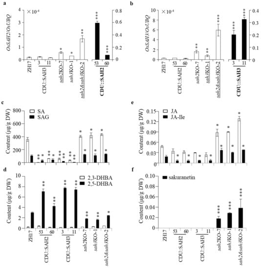 Expression of OsSAH2 and OsSAH3 was increased in the double knockout (sah2&sah3KO) and the single-knockout mutants, and their expressions were dramatically elevated in its own overexpressing lines (Figure 5a,b). The content of SA, as the substrate of OsSAHs, was remarkably reduced in OsSAH-overexpressing plants and increased in sahKO mutants (Figure 5c). The accumulation of 2,5-DHBA product was increased in OsSAH-overexpressing lines, whereas the content change of 2,3-DHBA was minor (Figure 5d). The increase in SA accumulation and OsSAHs expression in the sahKO mutants revealed that a new SA homeostasis was reached.