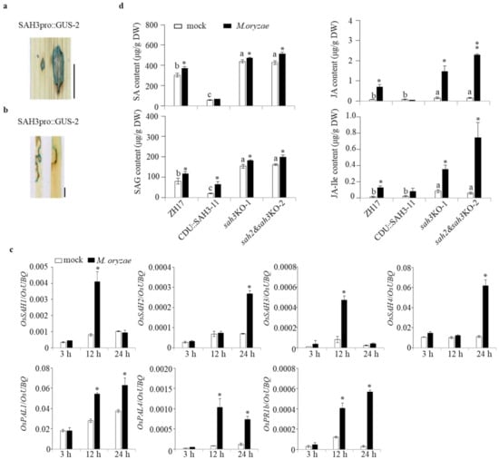 Induction of OsSAHs expression and alternation of phytohormone accumulation by M. oryzae. (a,b) Induction of OsSAH3 promoter expression by M. oryzae. The promoter transgenic plants (SAH3pro::GUS-2) were challenged with M. oryzae SZ strain by infiltration (a) as described in Figure 4 and foliar spray (b). Three-week-old rice plants grown in soil were inoculated with M. oryzae SZ strain by spraying the spore suspension (5 × 105 conidia/mL containing 0.005% Silwet L-77) or 0.005% Silwet L-77 as the mock treatment. The leaves were sampled for GUS staining, gene expression, and compound determination at the designated time point. Experiments were performed at three biological repeats with similar results. Representative GUS staining images of the lesions stained at 37 °C for 4 h. Bar = 1 cm. (c) Induction of OsSAHs and defense-related genes by M. oryzae SZ. Transcript level was determined by qRT-PCR using OsUBQ as the reference gene. (d) Compound changes induced by M. oryzae. The contents of compounds were determined by LC–MS/MS using D5BA as an internal standard. Values are given as means ± SD (n = 3). Asterisks indicate statistically significant differences compared with the mock (Student’s t-test, *, p < 0.05; **, p < 0.01), and columns marked with different letters (a–c) indicate significant differences analyzed by the SPSS software (Duncan’s multiple range test, α = 0.05).
