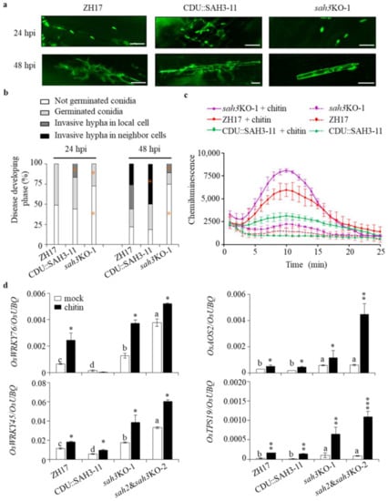Knockout of OsSAH3 increased basal immunity. (a,b) Infection development of M. oryzae in the transgenic and control plants. Overexpressing (CDU::SAH3-11) and knockout (sah3KO-1) of OsSAH3 and ZH17 control plants were inoculated with spores of M. oryzae SZ-GFP strain (1 × 105 conidia/mL) by infiltration into sheath cells. The spore germination and mycelia growth in the inoculated epidermal layer were evaluated under a fluorescence microscopy. Representative fluorescent images (a) and disease development (b) were photographed and quantified, respectively, at 24 h and 48 h post the inoculation. More than 100 spores in each line were analyzed. Data from two independent experiments are shown. Asterisks indicate statistically significant differences compared with ZH17 of the same developing stage (Student’s t-test, *, p < 0.05). Bar = 50 μm. (c) chitin-induced ROS burst in the transgenic and control plants. Rice leaf disks were treated with chitin or water. Induction of ROS was detected with a chemiluminescence assay using luminol as the substrate. Values represent means ±SD (n = 3). (d) Induction of the defense-related genes by chitin. Ten-day-old rice plants, cultured hydroponically in 1/2 MS, were treated with chitin for 1 h and sampled for total RNA isolation. Gene expression was determined by qRT-PCR using OsUBQ as the reference gene as described in Figure 3. Results from a representative experiment are shown. Experiments were biologically repeated twice with similar results. Asterisks indicate statistically significant differences compared with the corresponding mock using student’s t-test (**, p < 0.01; ***, p < 0.001). Columns marked with different letters (a–d) indicate significant differences, as analyzed by the SPSS software (Duncan’s multiple range test, α = 0.05).