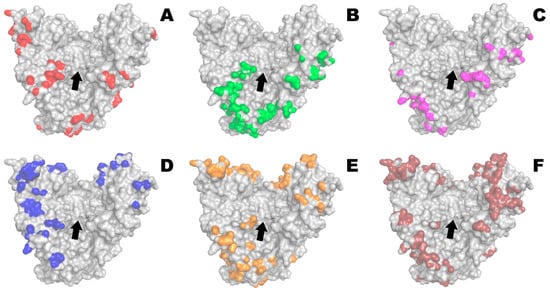 Domains of PvdQ (PDB 4m1j) covered by PLE50 (A), PLD50 (B), PEG-PLE50 (C), PEG-PLD50 (D), PLE50-PEG-PLE50 (E), and succinylated gelatin (gelofusine) (F), and thus capable of interacting with them within enzyme–polyelectrolyte complexes. The entrance into the active site is highlighted by the arrow; it localizes in the hollow of the V-shaped protein molecule, being slightly tilted forward in the figure for illustration purposes.
