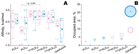 The lowest and highest binding energies (i.e., affinity) were estimated for PLD50 and PEG-PLE50, respectively (Figure 2). Though there was a statistically significant difference in the means of affinity (according to one-way ANOVA, p = 0.007), only groups PLD50 vs. PEG-PLE50 and PLD50 vs. PEG-PLD50 differed enough (according to Holm-Sidak pairwise multiple comparison method, p = 0.017 and p = 0.022, respectively), while the other groups had no statistically significant difference.