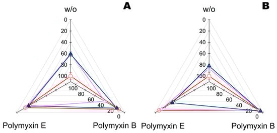 Residual intracellular ATP quantity (%) in B. subtilis (A) and E. coli bacterial cells (B) exposed for 24 h to bacterial cellulose treated with polymyxin B or polymyxin E, enzymes (His6-OPH or PGA), or their combinations. ATP of bacterial cells similarly exposed on the same bacterial cellulose with treatment by buffer (i.e., controls) was taken as 100%. All solutions were prepared in a PBS buffer (pH 7.4), and enzymes were additionally stabilized in complexes with PLE50. Designation: ○—control without enzyme, ✩—with PGA, ▲—with His6-OPH, w/o—without polymyxins.