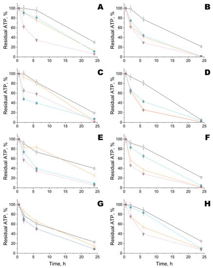 Kinetics of residual intracellular ATP quantity in B. subtilis (A,C,E,G) and E. coli bacterial cells (B,D,F,H) during their exposure on different fiber materials #1 (A,B), #2 (C,D), #3 (E,F) and #4 (G,H) treated with Ta NPs, enzyme His6-OPH, or their combinations. ATP quantity in bacterial cells at 0.5 h was taken as 100%. The His6-OPH was prepared as a complex with PEG-PLE50 in a Na-carbonate buffer (pH 10.5). Designation: ○—control, ■—Ta NPs, ∆—His6-OPH, ▼—Ta NPs with His6-OPH.