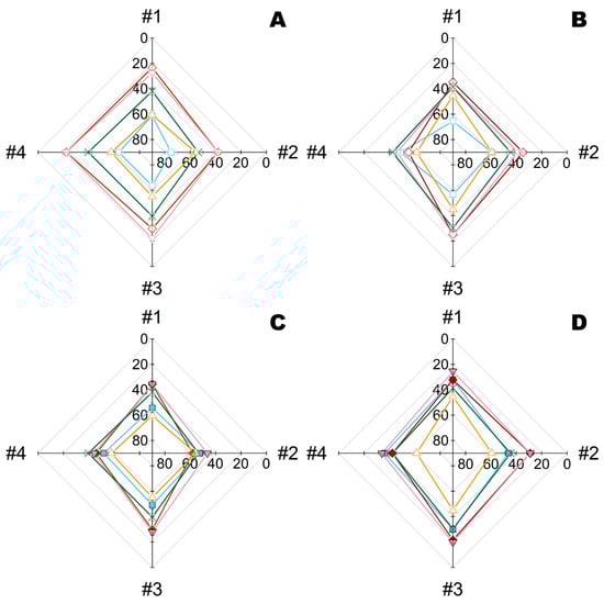 Residual intracellular ATP quantity (%) in B. subtilis (A,C) and E. coli bacterial cells (B,D) exposed for 24 h on multiple fiber materials (#1, #2, #3, and #4) treated with Zn (A,B) or Ta NPs (C,D), enzymes (His6-OPH or PGA), or their combinations. ATP of bacterial cells similarly exposed on the same materials with treatment by buffer (i.e., controls) was taken as 100%. All solutions were prepared in a Na-carbonate buffer (pH 9.5) and enzymes were additionally stabilized in complexes with PLE50. Designation: □—Zn NPs, ×—PGA, ∆—His6-OPH, ◇—Zn NPs with, ▽—Zn NPs with His6-OPH, ■—Ta NPs, ◆—Ta NPs with PGA, ▼—Ta NPs with His6-OPH.