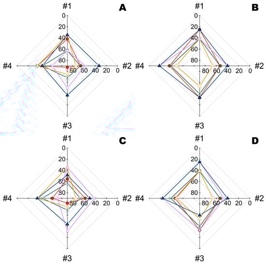 Residual intracellular ATP quantity (%) in B. subtilis (A,C) and E. coli bacterial cells (B,D) exposed for 24 h on multiple fiber materials (#1, #2, #3, and #4) treated with polymyxin B (A,B) or polymyxin E (C,D), enzymes (His6-OPH or PGA), or their combinations. ATP of bacterial cells similarly exposed on the same materials with treatment by buffer (i.e., controls) was taken as 100%. All solutions were prepared in a PBS buffer (pH 7.4). Designation: ●—polymyxin, ×—PGA, ∆—His6-OPH, ✩ –PGA with polymyxin, ▲—His6-OPH with polymyxin.