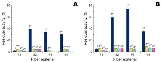 Despite positive results in genere, there are still some problems. Namely, His6-OPH seems to be actively eluted from all fiber materials (Figure 8). This process is highly likely to occur simultaneously with elution of metal NPs. In this work, they were simply adsorbed onto the fiber materials, and could be easily desorbed. To prevent such excessive losses, preliminary chemical and/or physical modification of such fibers could be helpful.