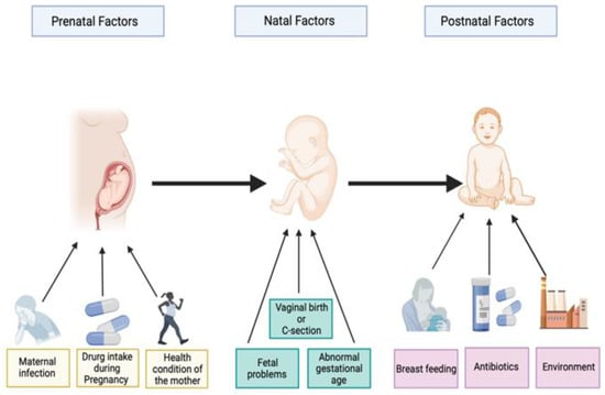 Several studies have found that 60 to 65% of autism occurrence could be explained by prenatal, natal, and postnatal environmental risk factors (Figure 1). Prenatal risk factors involve maternal infection, maternal physical health, the health condition of pregnant women, folate and iron deficiency, and drug use in pregnancy. Natal risk factors include fetal complications, umbilical cord complications, hypoxia (lack of oxygen), cesarean delivery, abnormal presentation of the fetus, and abnormal gestational age (preterm or post-term). Postnatal risk factors include breastfeeding, air contamination, antibiotic intake, and nutrition factors [,,,,]. Environmental risk factors can directly influence the neuronal activities of the growing brain of the fetus []. These environmental risk factors are largely found to shape the intestinal microbiota []. Therefore, the lack of an imprecise cause of the development of autism disorder has prompted scientists to look into other putative triggers, such as the intestinal microbiota.