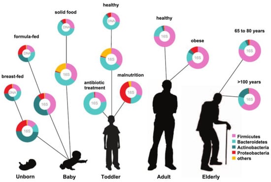 Following delivery, the baby is introduced to bacteria during breastfeeding, through the intake of food, and from the surrounding environment []. Many research studies have found that the diversity of the gut microbiota is decreased in formula-fed compared with breastfed children []. Key alterations in the gut microbial composition occur throughout the weaning period because the infant moves from consuming formula or breast milk to solid food []. In adolescence, microbial diversity and functional capacities develop toward an adult-like microbial profile, with each individual having a unique microbial community [,,]. No two people have the exact same microbial community—not even monozygotic twins []. In adulthood, nutrition and antibiotics are the essential aspects that impact the composition of the gut microbiota across the human lifespan []. Consequently, the description of the adult microbiota state as ‘stable’ is somewhat imprecise, as the gut microbial community alters over time and can be restored after changes [] (Figure 2).