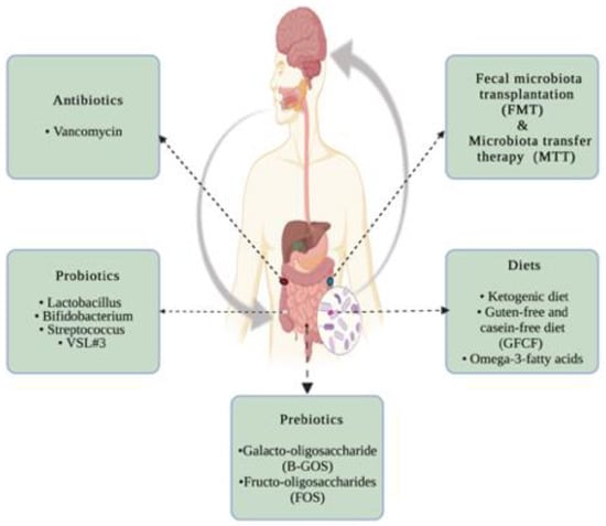 There is no current reliable therapy for treating patients with ASD. However, because of the increasing amount of data regarding the role of gut microbial dysbiosis in ASD, researchers are currently focusing on strategies for treating such a disease by modulating the gut microbial community as a potential therapeutic approach. This approach involves oral prebiotic, probiotic, dietary, and/or fecal microbiota transplantation (FMT) as well as microbiota transfer therapy (MTT; Figure 4 and Table 2).