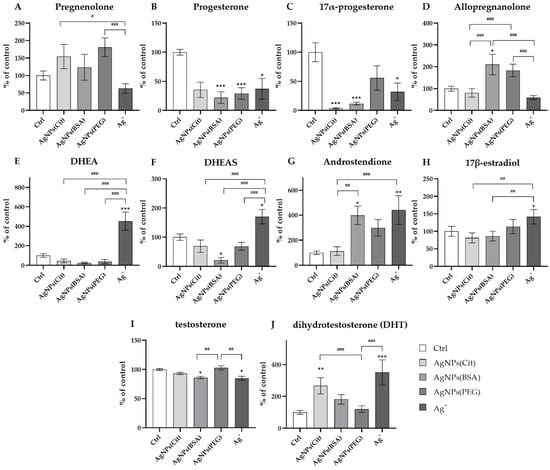 Neurosteroid levels in the hippocampus of rats exposed to AgNPs with different types of coating (citrate, bovine serum albumin (BSA) and polyethylene glycol (PEG)) or Ag+: (A)—pregnenolone; (B)—progesterone; (C)—17α-progesterone; (D)—allopregnanolone; (E)—dehydroepiandrosterone (DHEA); (F)—dehydroepiandrosterone sulfate (DHEAS); (G)—androstenedione; (H)—17β-estradiol; (I)—testosterone; (J)—dihydrotestosterone (DHT). Data are expressed as mean ± SEM. *, **, *** Significantly different from the control group (* p < 0.05, ** p < 0.01, *** p < 0.001) (Tukey post hoc test). #, ##, ### Significant differences between the groups exposed to AgNPs or Ag+ (# p < 0.05, ## p < 0.01, ### p < 0.001) (Tukey post hoc test).
