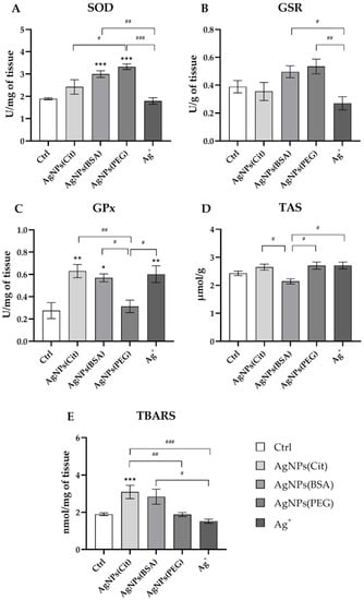 The results of the analysis of lipid peroxidation, which are expressed as the concentration of thiobarbituric acid-reactive substances (TBARS), are presented in Figure 2E. The TBARS levels in the studied groups were also influenced by silver administration (ANOVA: p = 0.001). Statistically significantly higher TBARS concentration was found in the control group and the AgNPs(Cit) group (post hoc: p < 0.01). AgNPs(BSA) treatment resulted in a significantly higher TBARS concentration in comparison to Ag+ (post hoc: p < 0.05). Similarly, AgNPs(Cit) treatment resulted in much higher lipid peroxidation level than AgNPs(PEG) and Ag+ (post hoc: p < 0.01 and p < 0.001, respectively).