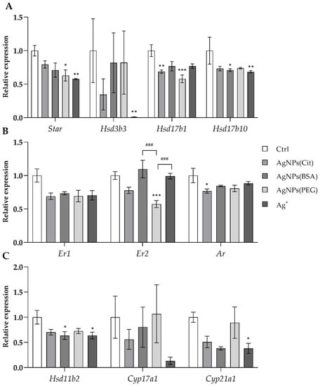 Relative expression of the genes involved in neurosteroid synthesis and metabolism vs. the reference phosphoglycerate kinase (Pgk1) gene in the hippocampus of rats exposed to AgNPs with different types of coating (citrate, bovine serum albumin (BSA), and polyethylene glycol (PEG)) or Ag+: PEG) or Ag+: (A)—steroidogenesis genes (Star (steroidogenic acute regulatory protein), Hsd3b3 (hydroxysteroid (3β) dehydrogenase 3), Hsd17b1 (hydroxysteroid (17β) dehydrogenase 1), Hsd17b10 (hydroxysteroid (17β) dehydrogenase 10)); (B)—steroid metabolism genes (Er1 (estrogen receptor 1), Er2 (estrogen receptor), Ar (androgen receptor)); (C)—glucocorticosteroid synthesis genes (Hsd11b2 (hydroxysteroid 11β-dehydrogenase 2), Cyp17a1 (cytochrome P450, family 17, subfamily a, polypeptide 1), Cyp21a1 (cytochrome P450, family 21, subfamily a, polypeptide 1)). Data are presented in arbitrary units as a ratio of the expression of the target gene to the expression of the reference gene (Pgk1) with the control group calculated as 1. All values are presented as mean ± SEM. *, **, *** Significantly different from the control group (* p < 0.05, ** p < 0.01, *** p < 0.001) (Tukey post hoc test). ### Significant differences between the groups exposed to AgNPs or Ag+ (### p < 0.001) (Tukey post hoc test).